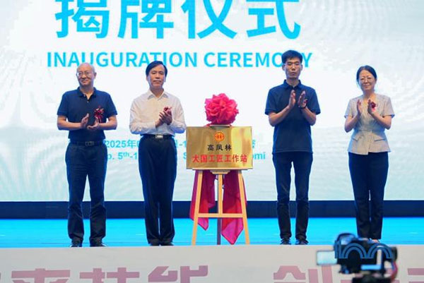 开幕式上,刘振英博士为高凤林主席颁发了“一带一路暨金砖国家技能发展国际联盟联席理事长”聘任证书。高凤林主席、彭维锋主任、贾平主席和李厚禄校长还共同为“大国工匠工作站”进行揭牌。